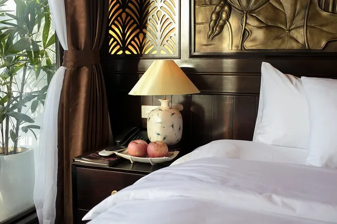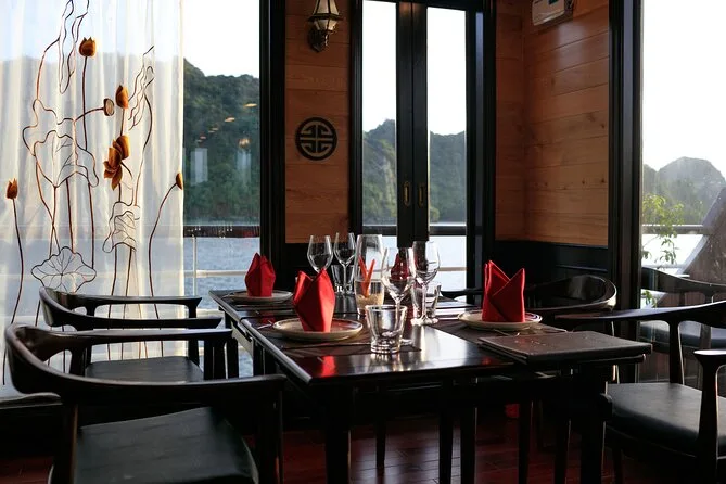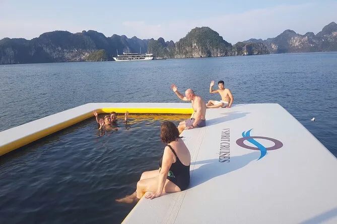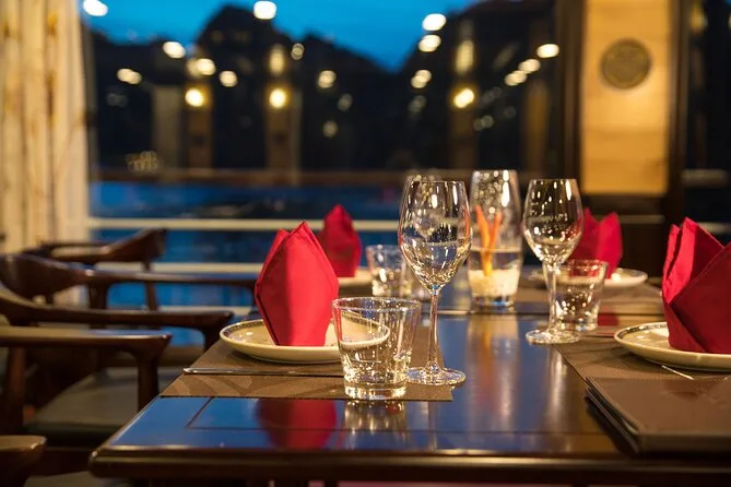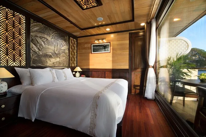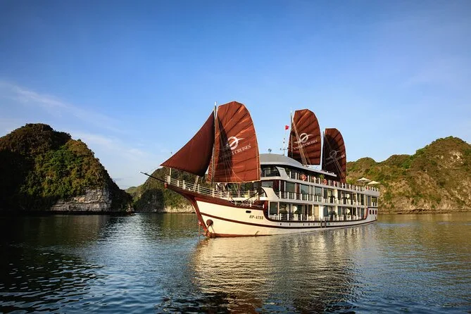 Tu día incluye recogida en hotel del Barrio Antiguo de Hanoi y regreso tras desembarcar en el puerto de Tuan Chau; todas las comidas a bordo—almuerzos con pescado fresco y platos locales, además de desayuno y brunch; bebidas de bienvenida; guía de habla inglesa como Hien que se encarga de toda la logística; paseo guiado en bote de bambú por Bright Cave con locales; kayak cerca de Tra Bau; fiesta al atardecer; actividades nocturnas como pesca de calamares o Tai Chi al amanecer; además de seguro y cargos por servicio durante todo el crucero nocturno.