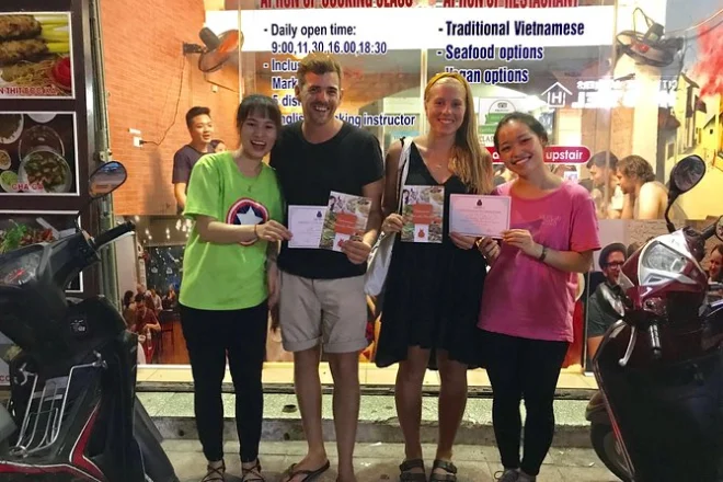 Tu mañana incluye un chef que habla inglés guiándote por el mercado principal de Hanoi para elegir ingredientes juntos, clases prácticas para preparar cinco platos tradicionales en una cocina local, degustación de tus creaciones acompañadas de vodka de arroz vietnamita y café de huevo o té, además de un libro de recetas y certificado para llevar a casa.