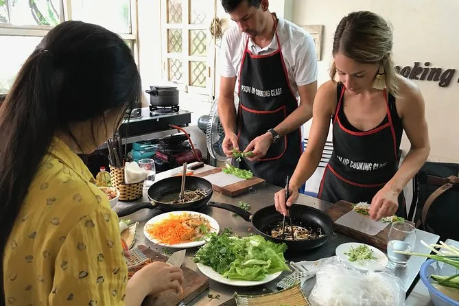 Volvimos a la cocina de Apron Up, justo en el Barrio Antiguo, con los brazos llenos de verduras y especias. Afuera la ciudad seguía ruidosa, pero dentro solo estábamos nosotros alrededor de mesas de metal. Linh nos enseñó a cortar la carne para el pho bo — más fina de lo que había logrado en casa — y explicó por qué nunca hay que apresurar el caldo. Mis manos olían a salsa de pescado durante horas después de preparar bun cha. Hubo un momento en que todos intentamos enrollar nuestro primer nem ran (rollitos de primavera) y el relleno salió disparado por un lado; todos nos reímos, hasta Linh.
