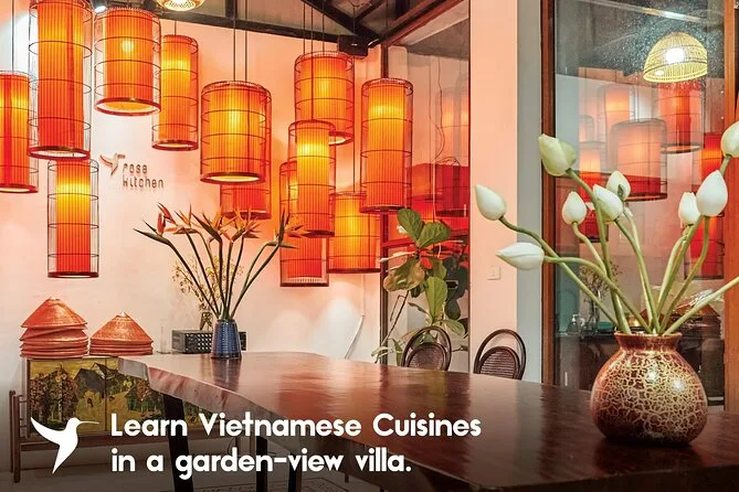 Tu día incluye traslado gratuito ida y vuelta en el Barrio Antiguo de Hanoi, todos los ingredientes frescos seleccionados en un mercado con tu chef guía, uso completo de equipos de cocina premium en una villa con jardín luminosa, agua y té de hierbas ilimitados al llegar, degustación de vino casero de frutas tras la comida y café vietnamita especial (huevo o coco), guías digitales de recetas si quieres guardarlas, y sí, guardan tu equipaje si necesitas un lugar seguro mientras cocinas y comes bajo los árboles.