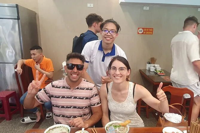 Probarás clásicos de la comida callejera de Hanoi como bun cha, banh cuon, fideos, postres de fruta fresca y café de huevo.