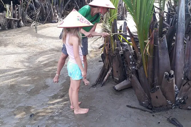 Pescar cangrejos fue más difícil de lo que imaginaba — fallé muchas veces, pero logré atrapar un cangrejito azul antes de que escapara. Anh aplaudió igual. El sol salió a mitad del paseo y todo se iluminó con un tono dorado por un instante; todavía recuerdo esa luz sobre el agua. Terminamos en la orilla con los dedos pegajosos por los pasteles de arroz que nos dieron. No fue nada lujoso — solo gente real mostrándonos su forma de vivir por una tarde.