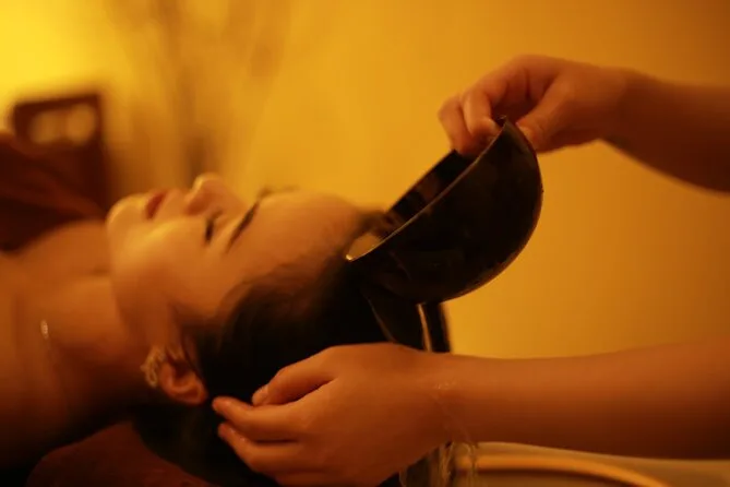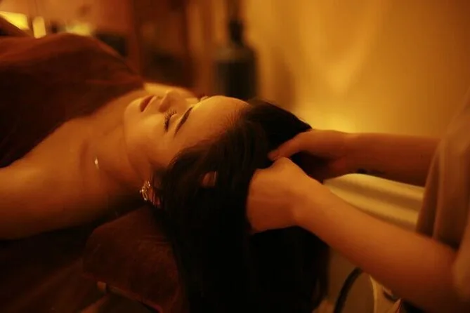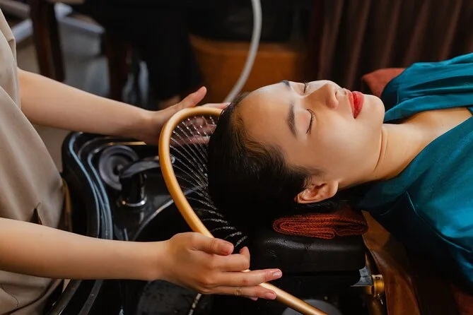 El aroma en la sala principal era suave, con toques de hierba limón y algo terroso. Cuando Linh empezó a verter agua herbal tibia sobre mi cabello, se sentía más denso de lo que imaginaba — no incómodo, sino reconfortante. Me masajeó el cuero cabelludo y el cuello con movimientos circulares lentos mientras una música suave sonaba de fondo. Hubo un instante en que todo lo demás desapareció, quedando solo sus manos y el sonido del agua cayendo en el lavabo. Es curioso cómo notas detalles mínimos cuando te obligas a bajar el ritmo.