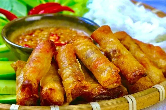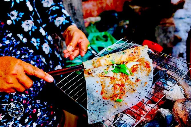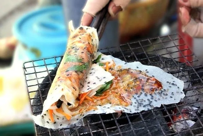 Probarás platos como papel de arroz a la parrilla (bánh tráng mắm ruốc), rollitos frescos a la parrilla (nem nướng), rollitos fritos (chả cuốn), panqueque crujiente de mariscos (bánh xèo hải sản), además de leche de maní o jugo natural.