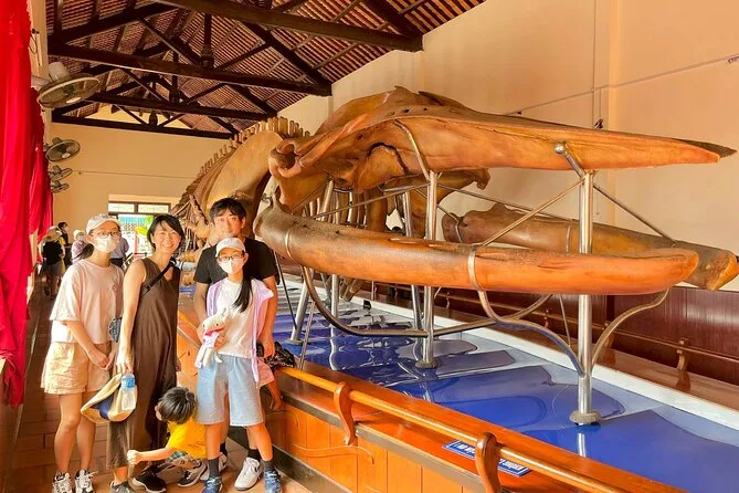 Luego paseamos por el templo Van Thuy Tu. Dentro hay un esqueleto de ballena (22 metros — Minh lo repitió dos veces porque al principio no le creí), y al parecer los pescadores locales vienen aquí a pedir suerte antes de salir al mar. El aire estaba cargado y salado por la cercanía del océano. Algunos hombres mayores nos saludaron con la cabeza al pasar; uno sonrió cuando me vio mirando los huesos con curiosidad. “Big fish,” dijo en inglés, y se rió.