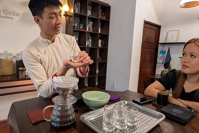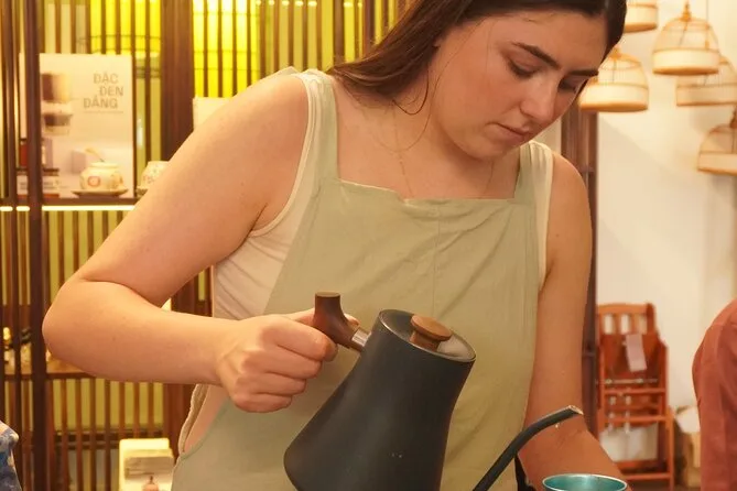 Nos reímos mucho intentando servir sin derramar (no es fácil), y Linh nos habló de la finca de su familia en Da Lat, de donde vienen algunos granos. Hubo un momento especial cuando contó que parte del pago del taller va para que niños de esa zona puedan ir a la escuela — eso hizo que todo se sintiera menos turístico y más auténtico. Aún recuerdo la vista por la ventana: cables enredados afuera, el sol iluminando paredes amarillas viejas.