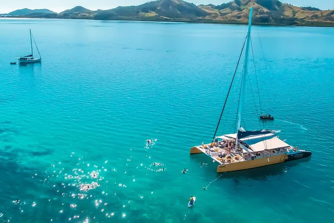 Your day includes return hotel pickup by coach from Nadi or Denarau areas to Port Denarau where you’ll board SABRE for a full-day sailing adventure through Fiji’s Mamanuca Islands. You’ll have use of snorkel gear and paddle boards at untouched reefs and sand cays. Morning tea and a chef-designed buffet lunch are served onboard along with complimentary soft drinks all day plus beer and wine from lunchtime onwards before returning in the evening.