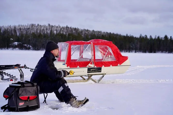 Your day includes pickup and drop-off from your hotel or nearby location, full thermal winter clothing (overalls, boots, beanies, mittens), all necessary ice fishing equipment like rods and bait plus stools to sit on while you fish. A local guide leads you through every step in English (or French/Spanish/Finnish if you ask), with sausage, cookies, and hot blueberry juice served as you relax by your hole in the ice before heading back warmed up inside and out.