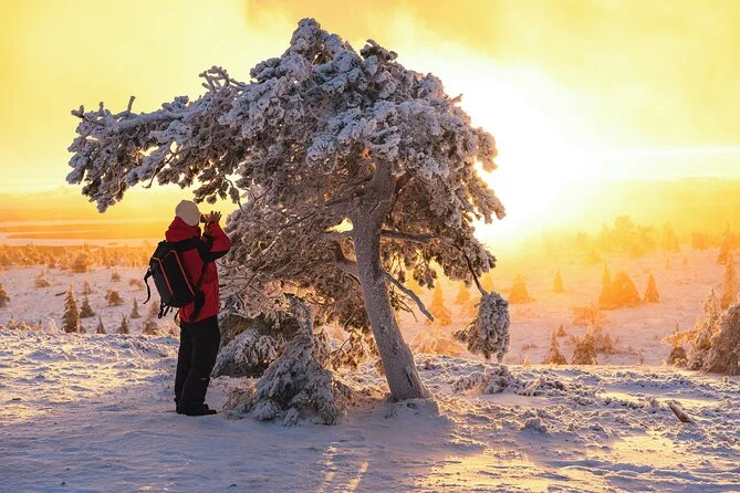 Your day includes hotel pickup and drop-off by minivan, all warm winter clothing and boots you’ll need, guidance from a local wilderness photographer throughout Riisitunturi National Park, multiple stops for photos along the way, BBQ gear with a light lunch outdoors plus hot drinks and snacks by the fire, and finally a set of edited photos sent to you after your adventure.