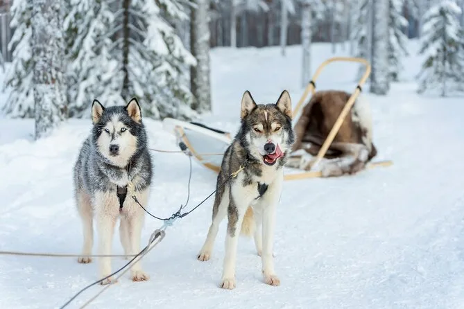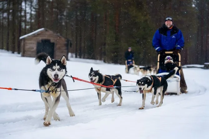 You’ll drive your own husky sled across snowy Lapland forests near Rovaniemi, guided by locals who know every trail and every dog by heart. After racing through silence and cold air, you’ll gather around a fire for a traditional barbecue lunch before heading back warm and full — probably still grinning from the ride.