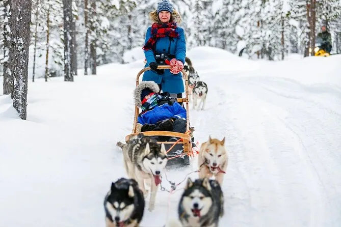 Your day includes pickup and drop-off from Santa Claus Holiday Village Hotel or their office in Rovaniemi, warm winter clothing (overalls, boots, gloves), a roughly 10km self-drive or passenger husky sleigh ride led by an English-speaking guide (other languages available), a visit to a working Husky Farm with stories about training these incredible dogs, plus Finnish gingerbread cookies and hot drinks around the fire before heading back out into the snow.