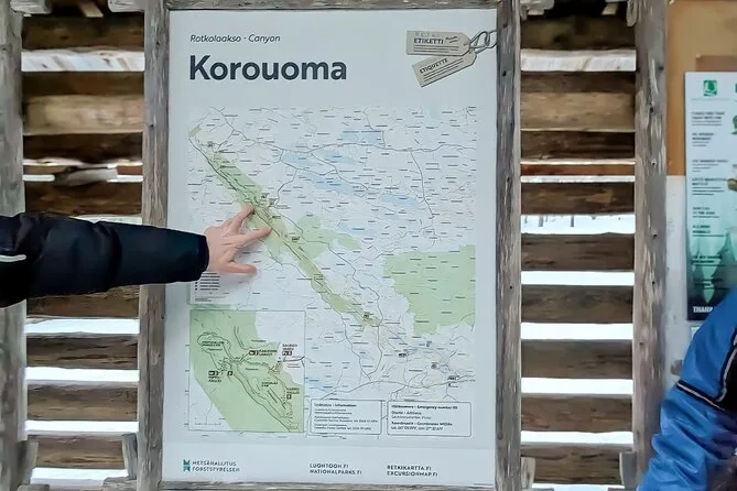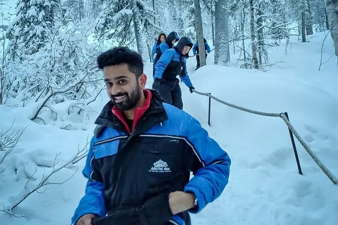 The trail started off quiet except for the squeak of boots on snow and the occasional call from some bird I couldn’t see. The air smelled clean in a way I can’t really describe — like ice and pine needles. Sini pointed out animal tracks as we walked; she said they might be fox or even reindeer. There was this one spot where you could hear water moving under the ice if you stood really still. Honestly, I almost missed it because I was distracted by how blue the light looked against the canyon walls.