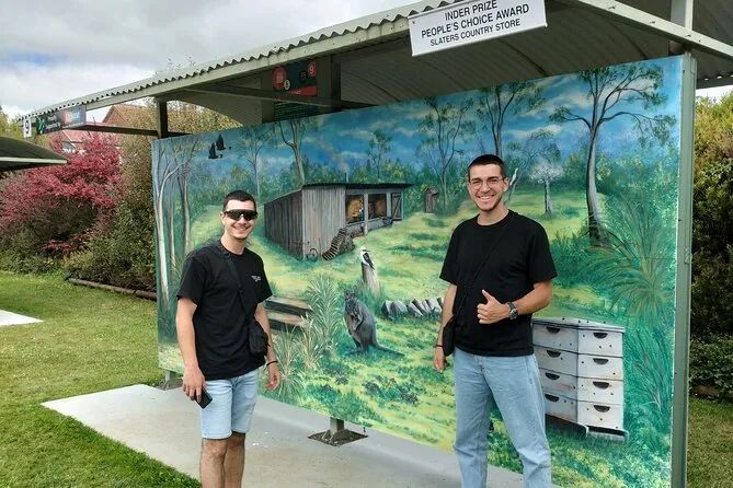 L’air avait cette fraîcheur piquante typique de la Tasmanie lorsque nous sommes arrivés à Sheffield tôt le matin. Les habitants étaient déjà dehors, discutant autour de cafés à emporter d’un petit café de coin — je ne me souviens plus du nom, mais l’odeur du pain frais flottait dans la rue principale. Les fresques recouvraient presque tous les murs, certaines fanées par les années, d’autres éclatantes et récentes. Notre guide nous a montré quelques-unes cachées derrière la boulangerie — faciles à manquer si on ne lève pas les yeux. Le festival des fresques de novembre était encore à plusieurs semaines, mais on pouvait déjà apercevoir des artistes préparant leurs panneaux dans des coins tranquilles.