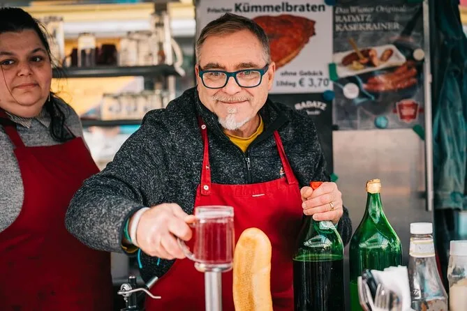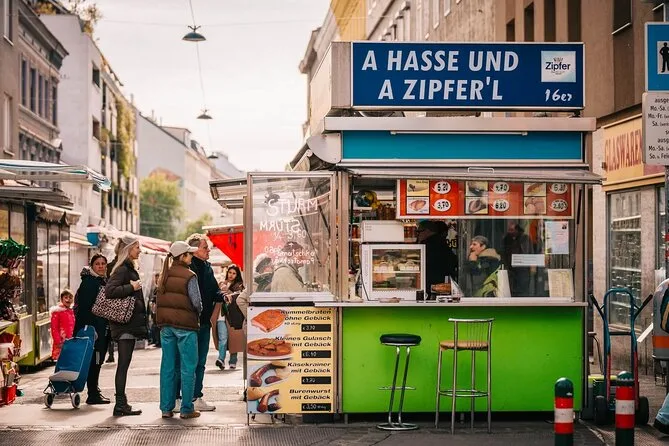 Vous goûterez des pâtisseries au Naschmarkt, du chocolat, des plats classiques comme le goulash ou le krautfleckerl au déjeuner, des spécialités street food comme la saucisse Käsekrainer, ainsi que desserts et boissons.