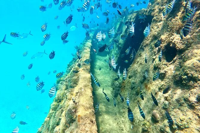 Ensuite, nous avons dérivé vers la réserve marine de Folkstone pour la partie épave — je ne pensais pas m’extasier autant devant un vieux bateau coulé, mais voir les poissons tourbillonner autour, c’est fascinant. Des centaines de poissons filaient entre les poutres rouillées, leurs couleurs scintillant sous la lumière filtrée par l’eau. Le récif corallien tout proche semblait vivant lui aussi, ondulant doucement au rythme du courant. Je n’arrêtais pas de penser à quel point c’est étrange de flotter au-dessus de l’histoire, en sirotant un punch au rhum bien frais entre deux baignades (l’équipage n’arrêtait pas de remplir nos verres). Une musique douce jouait quelque part sur le pont — juste assez pour donner envie de rester un peu plus longtemps.