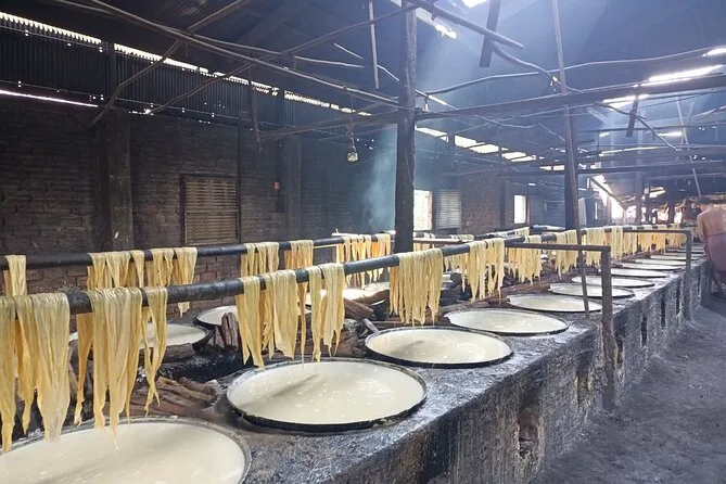 Le vélo est tranquille, je ne vois pas les kilomètres défiler — environ 25 à 30 au total, mais c’est plat et ombragé par des bananiers. Vana s’arrête de temps en temps pour montrer des champs de citronnelle ou des papayers ; à un moment, on croise des enfants qui jouent avec un cerf-volant artisanal, tout en ficelles emmêlées et rires. Une odeur douce flotte près d’un atelier de tofu — ni vraiment tofu, ni vraiment pain. Il nous fait signe d’approcher pour voir des femmes tisser des nattes de roseau, leurs mains bougeant si vite que je n’arrive pas à suivre. Dans une autre maison, une dame plus âgée nous montre comment on file la soie ; elle me laisse essayer de tordre les fils entre mes doigts (je rate complètement). Elle rit et dit quelque chose en khmer — Vana traduit : « Elle trouve que tu as les mains trop molles. »