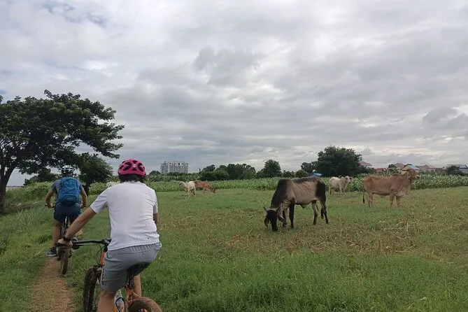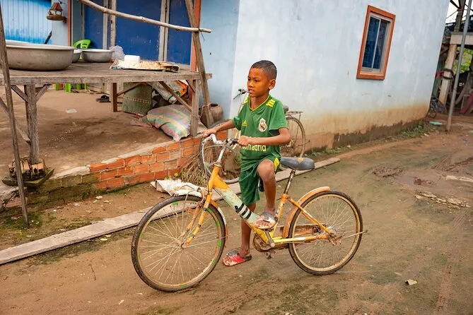 Votre journée comprend la prise en charge à l’hôtel à Phnom Penh en tuk tuk ou minivan selon la taille du groupe, les traversées en ferry sur le Mékong jusqu’à l’île de la Soie (Koh Dach), l’utilisation de VTT Cannondale avec casque, l’accompagnement d’un guide local anglophone lors de votre parcours à travers vergers et villages de tissage, l’accès aux ateliers visités, ainsi qu’un déjeuner cambodgien servi dans un restaurant flottant avant le retour en véhicule à votre hôtel en ville.