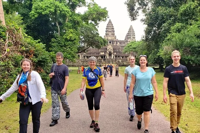 Votre journée comprend la location d’un vélo avec équipement de sécurité, de l’eau en bouteille tout au long du parcours, des encas cambodgiens au lac Srah Srang, un déjeuner local simple partagé sous les arbres près des temples — le tout accompagné par un guide local expérimenté qui vous racontera des histoires en vous faisant découvrir les sites incontournables de Siem Reap.