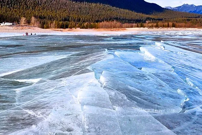 Bow Lake était plus calme que ce à quoi je m’attendais. On entendait le vent gratter la glace et, de temps en temps, un corbeau crier sans raison. Mei a distribué du thé chaud (elle proposait aussi du café, mais j’ai préféré le thé) et on est restés là, à regarder la lumière danser sur les montagnes. À Abraham Lake, ces fameuses bulles de glace sont encore plus fascinantes de près — certaines grosses comme un poing, d’autres minuscules comme des perles. C’est presque hypnotique de regarder à travers cette glace bleue. J’ai pris une centaine de photos, mais aucune ne rend vraiment justice à la beauté du spectacle.