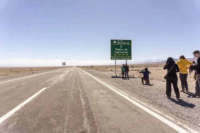Le trajet vers la lagune Chaxa fut silencieux, juste Camila qui fredonnait doucement en espagnol. En arrivant, j’ai ressenti cette étrange odeur de sel et de soleil dans l’air, piquante mais pure. Les flamants roses glissaient lentement sur l’eau, leurs reflets si nets qu’on aurait cru une mise en scène (ce n’était pas le cas). J’ai tenté une photo, mais j’ai vite abandonné ; ce genre de silence, ça ne se capture pas. Derrière nous, quelqu’un riait en voyant à quel point leurs pattes paraissaient roses à côté des oiseaux. On s’est arrêté au Tropique du Capricorne pour une photo rapide — je ne sais pas pourquoi, mais ça avait son charme.