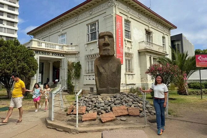Nous étions déjà en train de longer Viña del Mar quand j’ai réalisé à quel point l’air marin sentait vraiment le sel ici — un parfum vif et pur, mêlé à la douceur discrète des massifs fleuris. Notre guide, Camila, nous a montré l’Horloge Fleurie (je l’avais vue en photo, mais en vrai elle éclate de couleurs), puis nous a emmenés au musée Fonck. Devant, trônait un vrai Moai — honnêtement, je ne m’attendais pas à croiser un bout de l’île de Pâques posé là, au milieu de la ville. Camila nous a raconté l’histoire du peuple Rapa Nui pendant que quelques enfants tentaient de grimper dessus pour une photo. C’était étonnamment décontracté pour un objet si ancien.