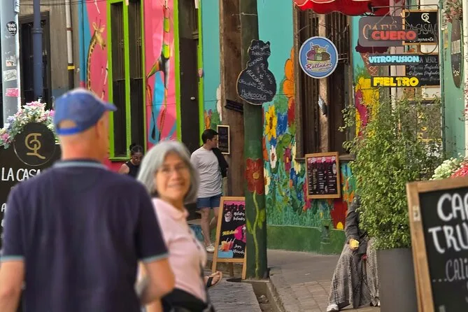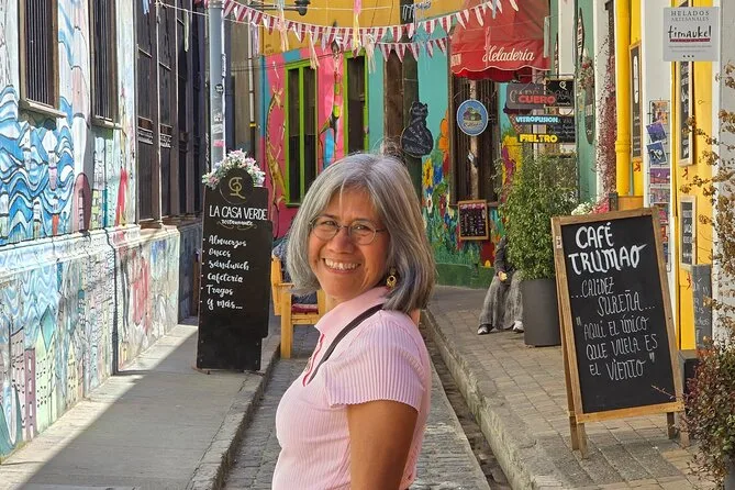 Le trajet jusqu’à Valparaíso a été rapide — à peine 20 minutes ? — mais tout a changé dès notre arrivée. Les rues serpentent sur des collines couvertes de fresques murales ; certaines sont folles et désordonnées, d’autres soignées et presque cachées. Nous avons pris le funiculaire El Peral (il grince et cliquette d’une façon qui vous fait rire nerveusement) jusqu’au Cerro Concepción. À un moment, je me suis arrêté juste pour écouter : une musique lointaine sortait d’une fenêtre ouverte, quelqu’un discutait doucement en espagnol en bas, des mouettes volaient au-dessus. Notre groupe s’est baladé dans des ruelles étroites, passant devant des cafés où les locaux nous saluaient d’un signe de la main ou d’un hochement de tête — un gars nous a même proposé un bout de son empanada (j’ai dit oui, elle était encore chaude). Pour le déjeuner, libre à nous de choisir ; Camila a donné quelques idées, mais on a flâné jusqu’à tomber sur un endroit aux chaises bleues un peu fanées et nappes colorées.