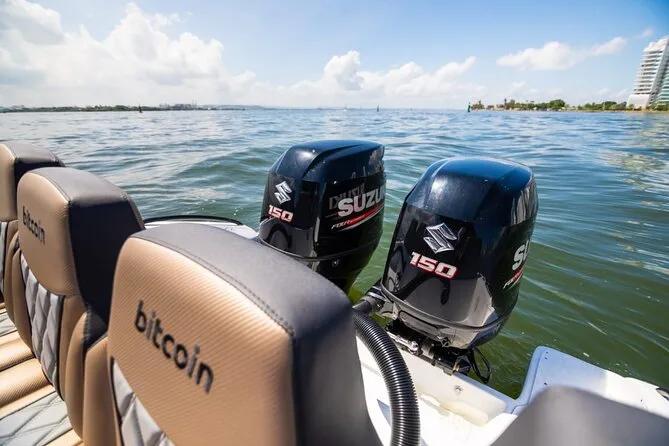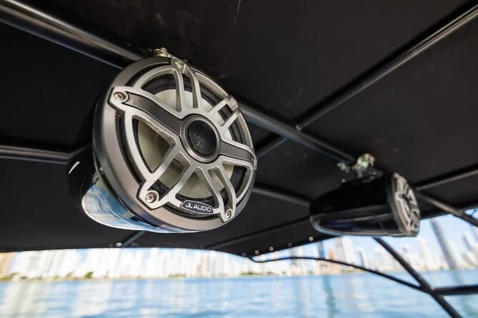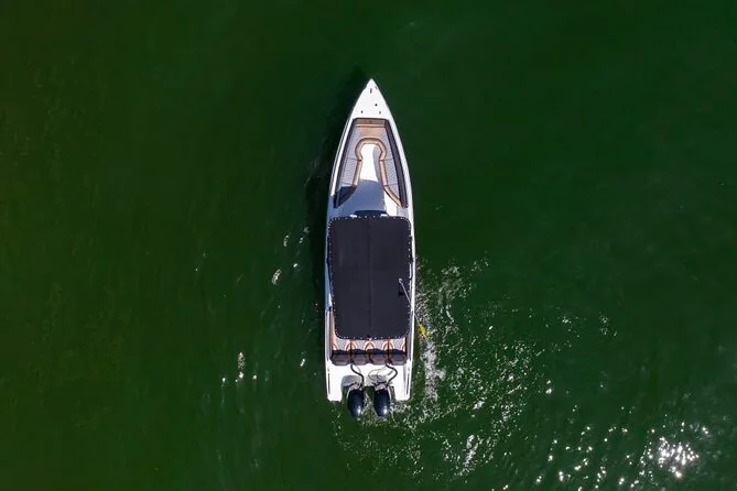 Le bateau est équipé de sièges en cuir haut de gamme, d’un système audio JL Bluetooth, d’un bain de soleil pour deux, d’une douche d’eau douce, de flotteurs et d’une grande glacière avec 10 kg de glace.