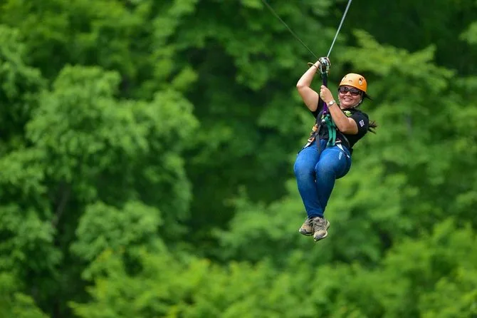 Au centre d’aventure, nous avons embarqué sur un tracteur pour une montée cahoteuse jusqu’à la colline. Les guides distribuaient les harnais en plaisantant, vérifiant chaque sangle avec soin. J’entendais des singes dans les arbres — honnêtement, mes mains étaient moites avant même de voir la première plateforme. Il y a 12 plateformes reliées par 10 tyroliennes, dont une qui fait presque un demi-kilomètre. En survolant la canopée, on aperçoit par moments l’océan entre les feuillages verts. Le vent sur le visage, c’est une montée d’adrénaline pure, mais ça passe en un éclair.