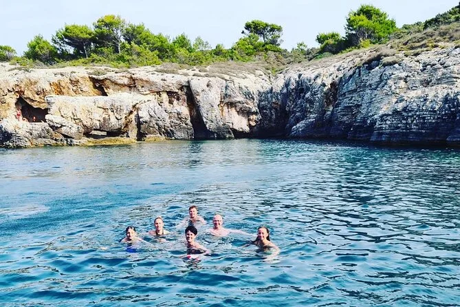 Le trajet jusqu’à Kamenjak a duré environ 50 minutes, mais ça ne paraissait pas long. Un silence s’est installé quand on s’est approchés — des falaises qui s’élèvent, des oiseaux marins qui tournent, puis Luka a demandé qui voulait nager dans la grotte. J’ai hésité (l’eau froide, ce n’est pas trop mon truc), mais j’ai fini par sauter. L’eau avait un goût presque métallique près des rochers. À l’intérieur, la grotte était fraîche et résonnante, comme si on était dans une cloche. Certains sont restés sur le pont à nourrir les poissons ou à bronzer — franchement, les deux semblaient parfaits.