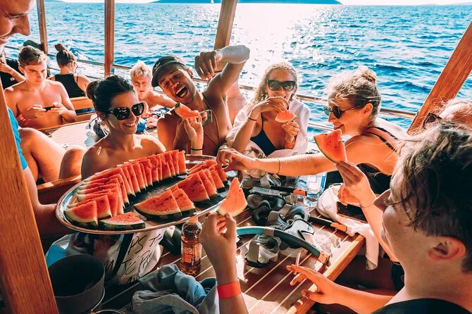 La Blue Lagoon, c’est exactement ce qu’on imagine — une eau limpide où l’on voit ses orteils, avec des petits poissons argentés qui filent partout si on daigne regarder en flottant. J’ai emprunté un masque (ils en avaient plein à bord) et j’ai dérivé un bon moment, à moitié plongé dans une playlist mêlée aux éclats de rire d’enfants qui jouaient près des rochers. Le déjeuner est arrivé juste au moment où la faim se faisait sentir : poisson grillé (je crois que c’était de la dorade), pain frais, et des tomates qui avaient vraiment le goût de tomates. On s’est installés sous de vieux pins, dans un bar de plage où l’ombre semblait plus fraîche qu’ailleurs sur terre. Il y avait du vin à volonté — peut-être un peu trop pour moi à midi.