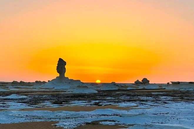 À midi, nous sommes arrivés dans la vallée d’Agabat. L’endroit est étrangement silencieux — pas d’oiseaux, pas de voitures, juste le vent et le bruit de nos pas sur le sable clair. Mahmoud a ri quand j’ai essayé de prononcer « Agabat » correctement (j’ai abandonné). Les falaises blanches semblaient venir d’une autre planète. Puis est venu le désert blanc : des formes calcaires partout, certaines ressemblant à des champignons ou des chameaux si on plisse les yeux. On a monté le camp alors que le coucher de soleil baignait tout d’une lumière dorée. Le dîner, un poulet grillé sur braises accompagné de riz épicé, avait un goût différent ici, en pleine nature. Dormir dehors était bizarre au début, mais je suis resté à contempler le ciel pendant des heures ; il y avait tellement d’étoiles que ça en devenait presque vertigineux.