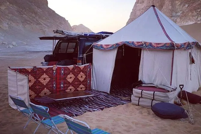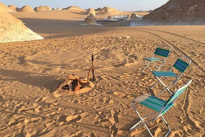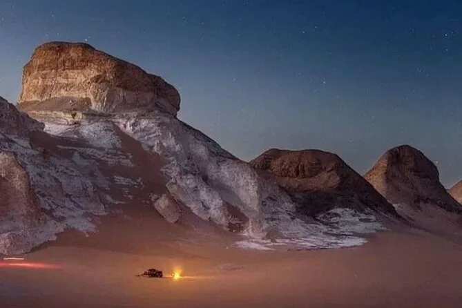 Votre aventure comprend la prise en charge au Caire en van privé (max 11 personnes), tout le matériel de camping pour une nuit dans le désert blanc, le déjeuner le jour d’arrivée, un dîner BBQ sous les étoiles, un petit-déjeuner avant le retour, des arrêts à l’oasis de Bahariya, aux monticules volcaniques du désert noir, aux falaises de la vallée d’Agabat, aux roches scintillantes de Crystal Mountain, ainsi qu’une pause rafraîchissante à une source naturelle avant de rentrer.