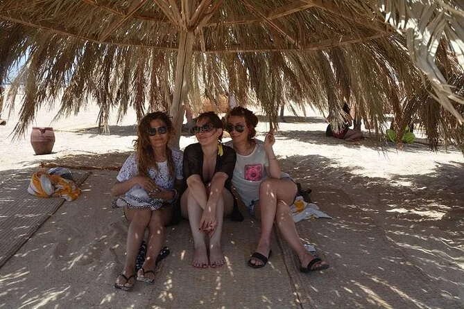 Le déjeuner s’est pris à bord — poulet grillé, riz, une salade qui avait bien meilleur goût que son apparence (je ne sais toujours pas ce qu’il y avait dedans). On a tous trop mangé, mais on a quand même trouvé l’énergie pour la balade en banana boat après. Je pensais être courageuse, mais j’ai crié plus fort que les enfants quand on a pris une vague de côté. J’ai eu du sable dans les cheveux pendant des heures en me prélassant sur la plage de l’île, écoutant des ados jouer de la pop égyptienne sur leur téléphone. L’île est plus calme que ce à quoi je m’attendais — juste le vent et des éclats de rire qui viennent des autres groupes de temps en temps.