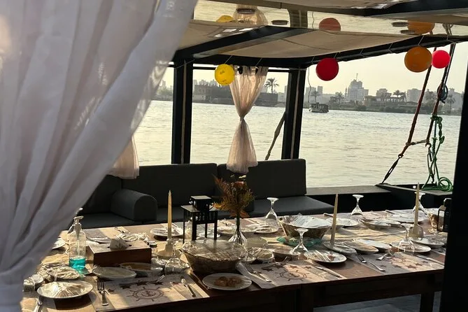 L’ambiance change quand on descend vers le centre du Caire pour notre croisière privée en felouque sur le Nil. La lumière devient douce, l’air plus calme ; quelqu’un a disposé des coussins et des fleurs sur notre bateau — rien de tape-à-l’œil, juste une attention délicate. Le bruit de la ville s’efface dès qu’on pousse les rames. Le déjeuner arrive (je repense encore à ce dessert feuilleté), et on glisse devant des pêcheurs qui nous saluent depuis les berges basses. Mon compagnon prend la barre un instant ; on part en vrille à gauche et on rit aux éclats, presque renversant nos verres. C’est un vrai plaisir de simplement se laisser porter et regarder le Caire défiler sous la lumière dorée de l’après-midi.