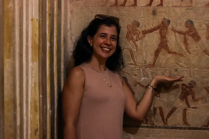 Parcourez les sables de Gizeh à Memphis avec un égyptologue privé, chevauchez des chameaux au milieu des pierres millénaires et partagez un déjeuner face aux pyramides