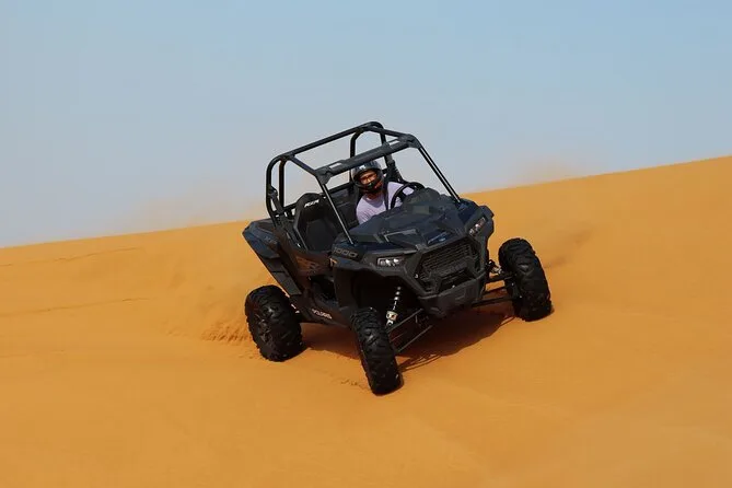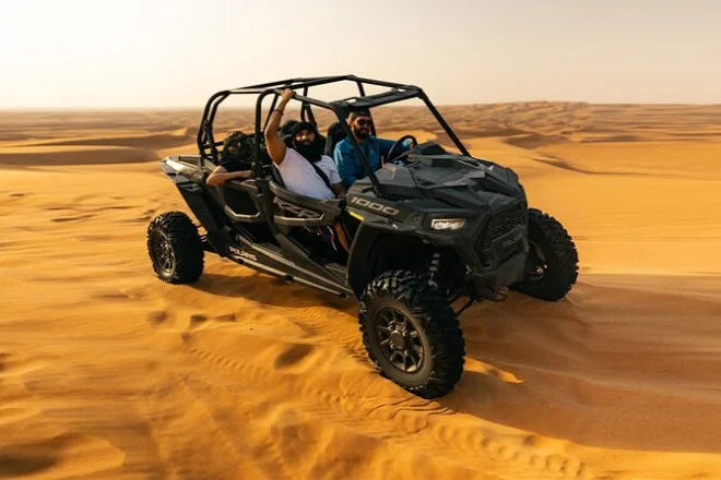 Votre journée comprend la prise en charge à l’hôtel ou au terminal de croisière à Dubaï, une heure de conduite d’un buggy Polaris 1000cc avec un guide pro (vous êtes au volant !), 15 à 20 minutes de sandboard sur les dunes, une courte balade à dos de chameau dans le désert, un transfert en 4x4 jusqu’au camp bédouin pour un spectacle avec danse orientale et Tanoura pendant le dîner buffet BBQ — avec café arabe, chicha près du feu, tatouages au henné si vous le souhaitez, et de nombreuses boissons avant le retour à votre hôtel.