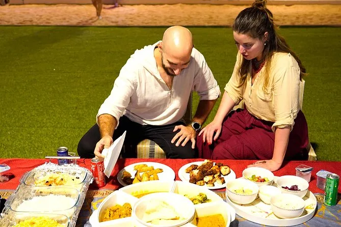 Le 4x4 est venu nous chercher juste au moment où la lumière virait au rose à l’horizon. On a roulé plus loin dans le désert jusqu’à ce que le camp apparaisse — lanternes allumées, musique qui démarre. Le dîner était un BBQ fumé (l’agneau grillé, un vrai délice), accompagné de café arabe et de dattes sucrées. Des danseuses tournaient dans leurs jupes colorées, certains essayaient des tatouages au henné près du feu. Je me suis installé avec une chicha un moment, et j’ai juste écouté — les rires, la musique, les conversations en plusieurs langues sous les étoiles. Même maintenant, je sens presque encore cette odeur de nuit dans le désert.