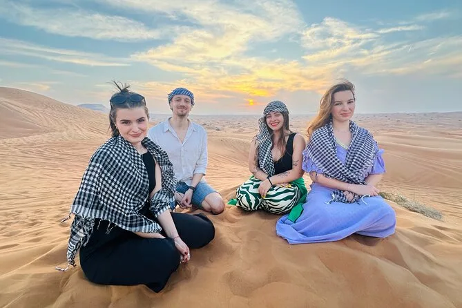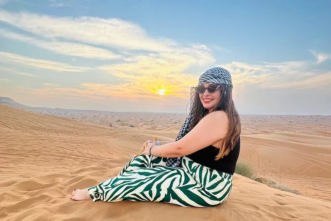 Votre journée comprend la prise en charge et le retour à votre hôtel ou appartement partout à Dubai ou Sharjah, une balade en quad de 30 minutes en autonomie sur les dunes d’Al Lahbab, un dune bashing guidé avec pauses photos au coucher du soleil, le matériel et l’initiation au sandboard si vous voulez essayer (vous devriez), ainsi qu’une douce balade à dos de chameau au crépuscule. Au camp, détendez-vous avec boissons à volonté ou thé (la cardamome est bien présente), dégustez un dîner BBQ fraîchement grillé avec options végétariennes, profitez de concerts live sous les étoiles, faites-vous tatouer au henné si vous le souhaitez — et testez même la shisha pomme avant de rentrer tard en ville.