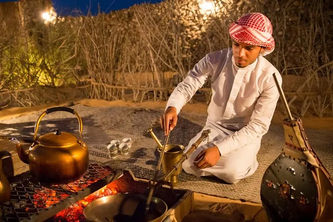 Votre soirée comprend la prise en charge et le retour à l’hôtel en véhicule climatisé depuis les hôtels de Dubaï ; une balade en caravane de chameaux de 45 à 60 minutes dans les dunes ; une démonstration de fauconnerie au coucher du soleil ; des activités traditionnelles comme la fabrication de pain et de café arabes en direct, ainsi que des tatouages au henné ; des spectacles émiratis ; et un dîner en quatre plats avec eau et jus avant le retour tardif à votre hôtel.