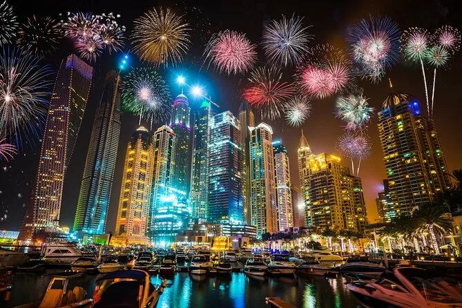 Montez à bord d’un Yellow Boat à Dubai Marina avec un guide local et naviguez devant Palm Jumeirah et Burj Al-Arab, sous un feu d’artifice spectaculaire à minuit. Couvertures pour rester au chaud et photos aidées par l’équipage rendent cette soirée inoubliable — un début d’année que vous n’oublierez jamais.