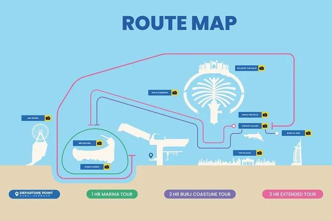 Vous verrez Dubai Marina, Palm Jumeirah, Bluewaters Island avec la grande roue Ain Dubai, l’hôtel Atlantis et bien plus.