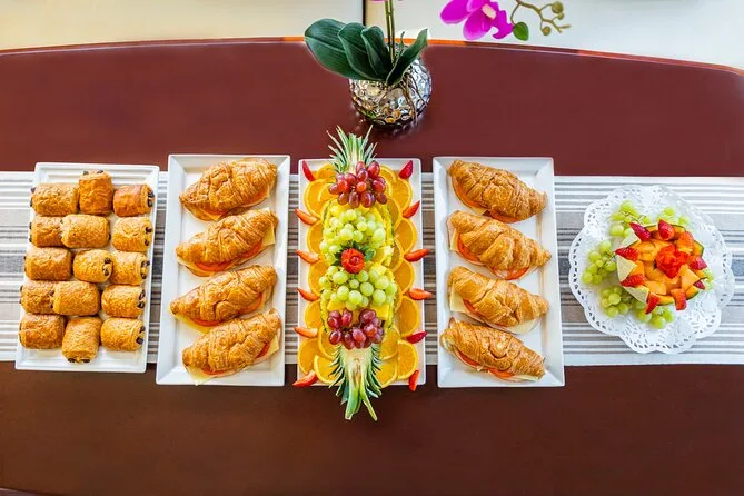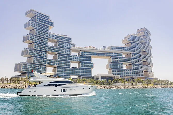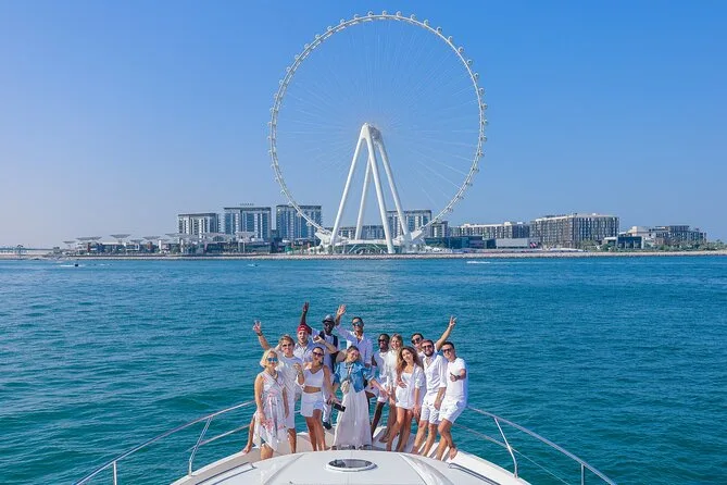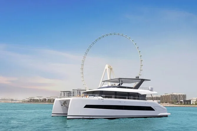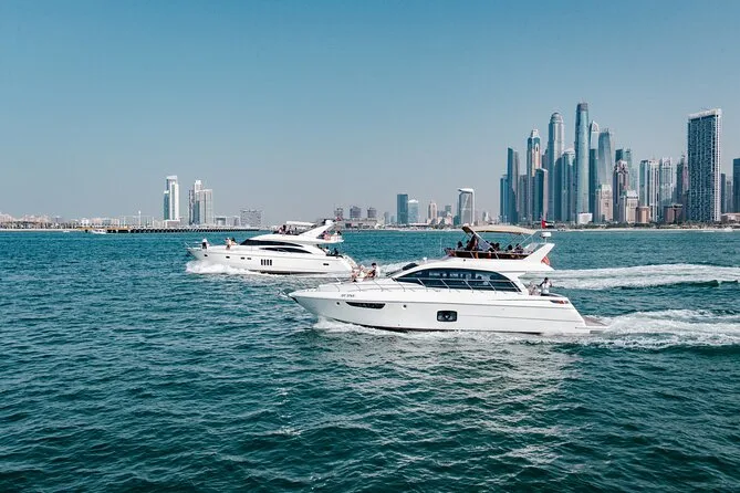 Votre journée commence au Dubai Harbour Yacht Club avec un capitaine et un équipage professionnels qui vous guideront à travers Dubai Marina et autour de Palm Jumeirah. Profitez d’un BBQ fraîchement préparé (avec options végétariennes sur demande), de jus et d’eau à volonté tout au long de la croisière en yacht de luxe — avec accès WiFi sur les tours plus longs. Musique à bord, gilets de sauvetage fournis pour la sécurité, et une ambiance conviviale que vous fêtiez ou que vous profitiez simplement des vues sur la ville.