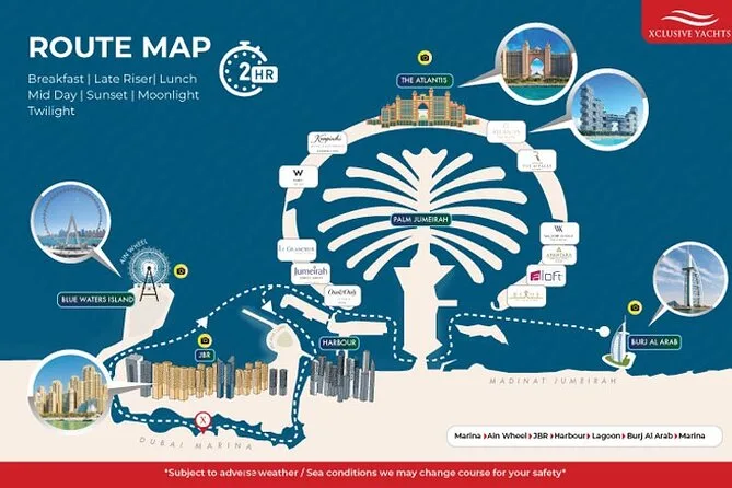 Vous passerez par Dubai Marina, Bluewaters Island (Ain Dubai), Jumeirah Beach, Palm Jumeirah, Atlantis et Burj Al Arab selon la durée de votre parcours.
