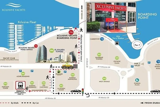 Le point de rendez-vous est près de Marina Mansion ; traversez au passage piéton puis descendez la rampe à côté du pont — l’équipage vous accueillera là.