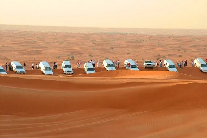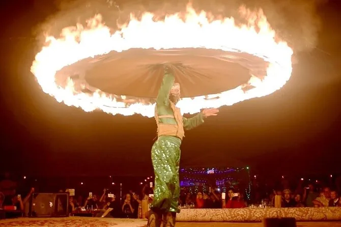Transferts aller-retour depuis Dubaï, dune bashing en 4x4 avec un chauffeur expérimenté, initiation au sandboard, balades à dos de chameau au camp, tatouages au henné, shisha dans une tente bédouine, spectacles live de danse orientale et Tanura au feu, et un dîner BBQ complet (options végétariennes et non végétariennes).