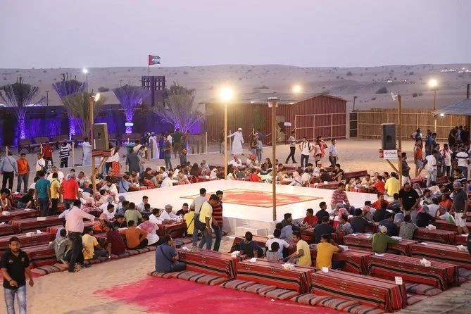 Votre expérience comprend le transfert hôtel aller-retour à Dubai, 40 minutes de dune bashing sur les dunes rouges de Lahbab, du sandboard, des balades à dos de chameau, eau et boissons sans alcool à volonté, café arabe et snacks, accès au salon shisha, peinture au henné, photos en costumes locaux, spectacles de danse du ventre, feu et tanoura, ainsi qu’un buffet BBQ végétarien complet sous les étoiles.