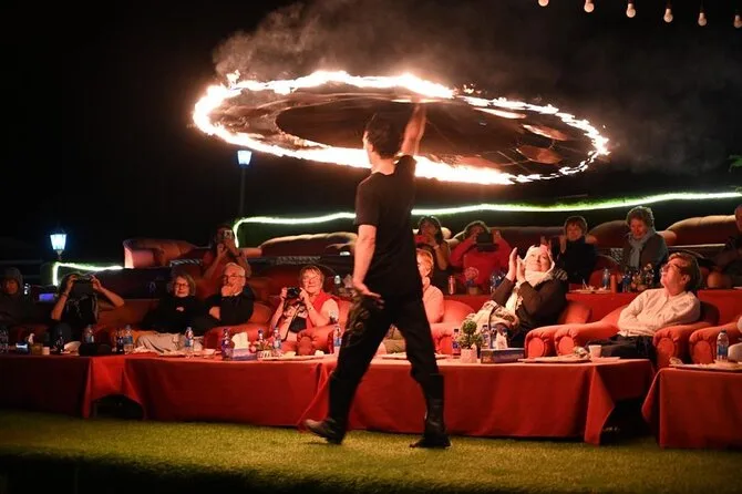Quand le soleil a commencé à baisser, on est arrivés au camp juste au moment où le ciel se teintait de ce rose orangé si typique du désert. L’ambiance était animée — des enfants s’essayaient au sandboard pour la première fois (j’ai tenté aussi, disons que ce n’est pas si simple), des femmes se faisaient dessiner de délicats motifs au henné sur les mains, et quelqu’un servait un café parfumé à la cardamome dans de petites tasses. Le buffet était prêt peu après : poulet grillé, aubergines fumées, pains plats tout chauds sortis du feu. Entre deux bouchées, on regardait le danseur Tanoura tournoyer si vite que sa jupe formait un tourbillon, puis tout le monde s’est tu pour le spectacle de feu — sauf une petite fille qui éclatait de rire à chaque étincelle.