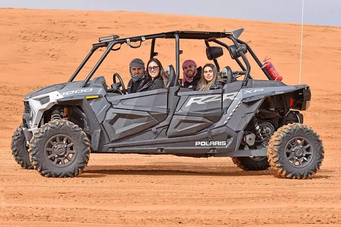 La première chose qui m’a frappé en arrivant au point de départ dans le désert, c’est l’étendue infinie de sable — doux, presque rosé sous les premiers rayons du soleil. Notre guide, Kareem, nous a remis des lunettes de protection et ces foulards traditionnels Ghutrah (je ne pensais pas à quel point ils seraient utiles avant que le vent ne se lève). Après une rapide signature de la décharge, il nous a expliqué comment manier les buggys. Ce n’était pas que de la théorie — il nous a montré quelques astuces simples pour piloter sur le sable meuble, ça a tout changé une fois au volant.
