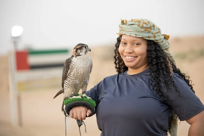 Plus tard, on a essayé la balade à dos de chameau — ils sont plus grands qu’on imagine de près. Le dresseur m’a passé les rênes en disant quelque chose en arabe que je n’ai pas compris ; il a souri quand même. La lumière devenait plus douce, tout virait au doré et rose. Tenir un faucon, c’était plus étrange que prévu — ses griffes piquaient à travers le gant, ses yeux étaient plus perçants que ceux de n’importe quel animal que j’ai rencontré. Notre guide a pris des photos en plaisantant sur mes « cheveux de désert ».