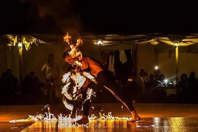 Vous profiterez du dune bashing en 4x4, du sandboard, d’une balade à dos de chameau pour les photos, de tatouages au henné, de spectacles live (danse orientale, tanoura, feu) et d’un dîner.